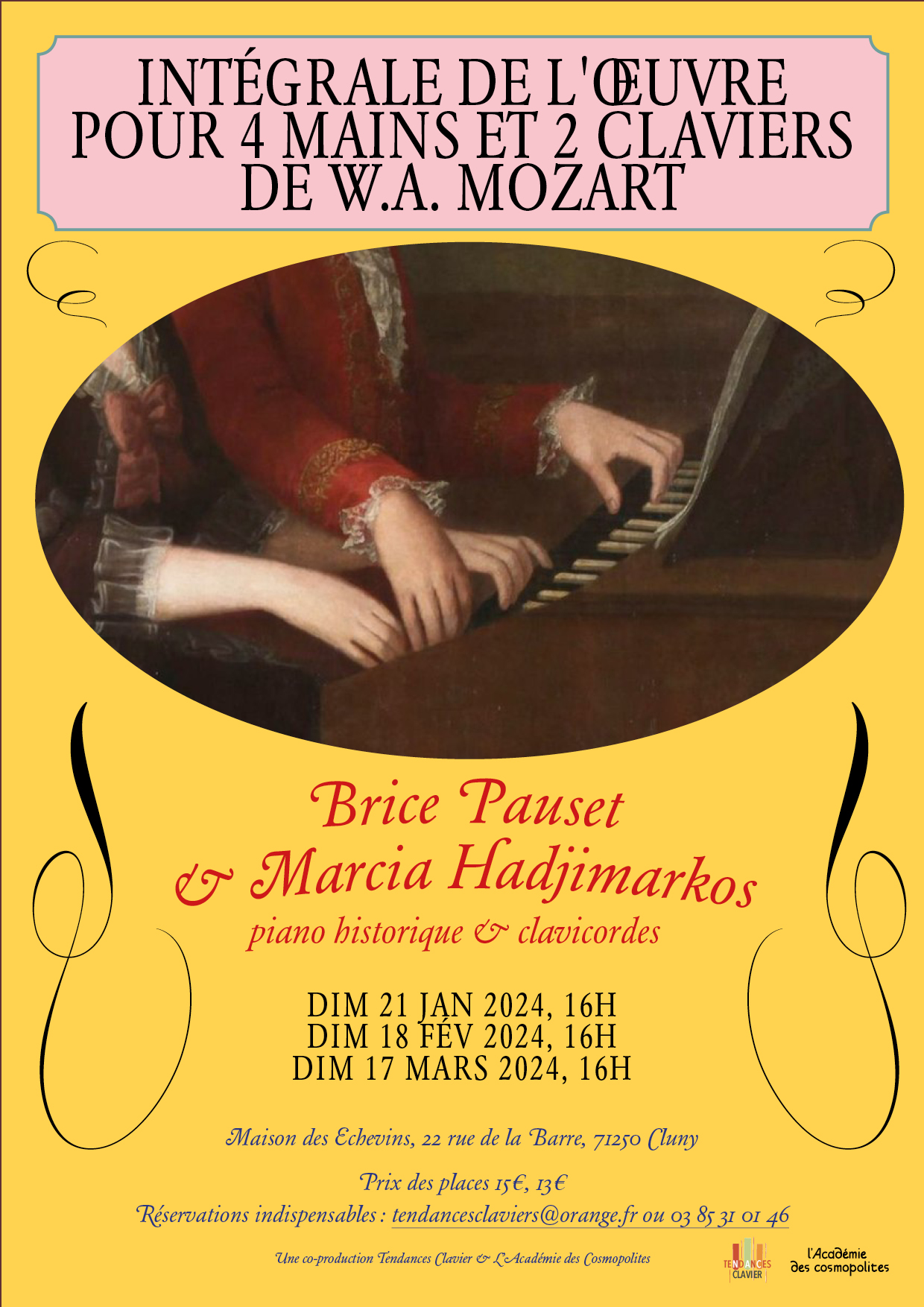 Save the dates ! Brice Pauset et Marcia Hadjimarkos vous offrent l’intégrale des pièces pour quatre-mains et deux claviers de Mozart dans une série de trois concerts début 2024 ! Cette musique sera interprétée sur piano historique et clavicorde dans le bel écrin de la Maison des Echevins à Cluny.