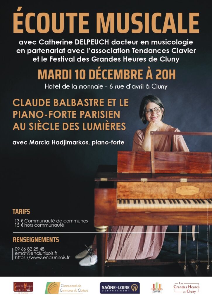 Pour fêter dignement les 300 ans de notre compositeur bourguignon préféré, et à la suite des 12 manifestations auxquelles nous avons participé pendant l’Année Balbastre, nous sommes heureux de collaborer avec Catherine Delpeuch, l’Ecole de Musique, Danse et Théâtre du Clunysois, la Communauté de Communes du Clunysois, et les Grandes Heures de Cluny le 10 décembre pour cette soirée d’écoute musicale à Cluny.