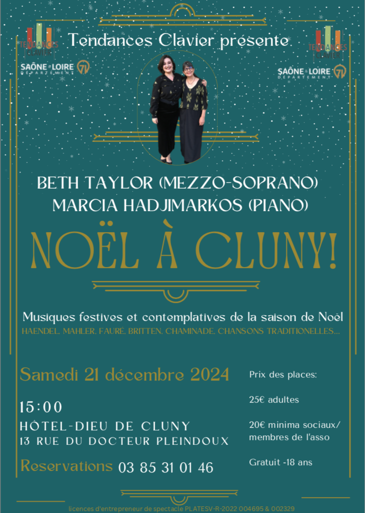 Save the date ! Une célébration de l’hiver et la saison de Noël à travers des chants sacrés et traditionnels et des lieder de compositeurs tels que Haendel, Fauré, Saint-Saëns, Mendelssohn, Wolf, Mahler, Chaminade, Britten…le tout interprété par la mezzo-soprano Beth Taylor: Mezzo-Soprano star montante de la scène lyrique internationale, et Marcia Hadjimarkos au piano. Le samedi 21 décembre 2024 à 15h dans le bel écrin de l’Hôtel-Dieu de Cluny.